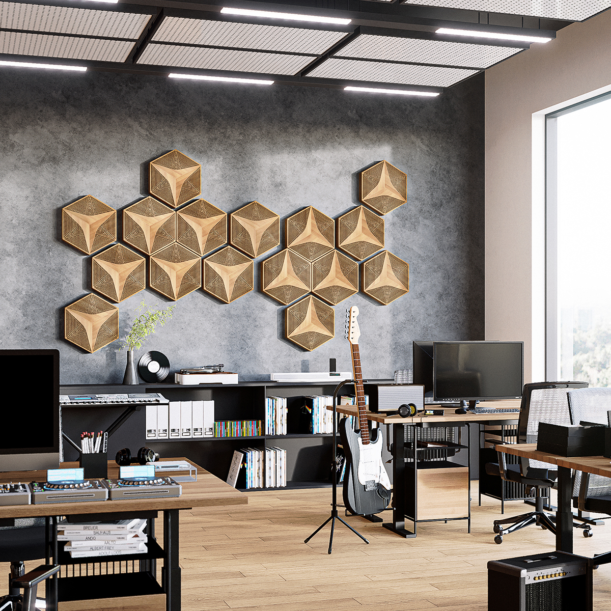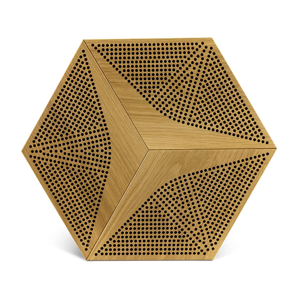 • Die sechseckige Form, die natürlichen Materialien und die präzise perforierten Oberflächen gewährleisten eine hervorragende Schallabsorption und ein originelles Design für jeden Innenraum