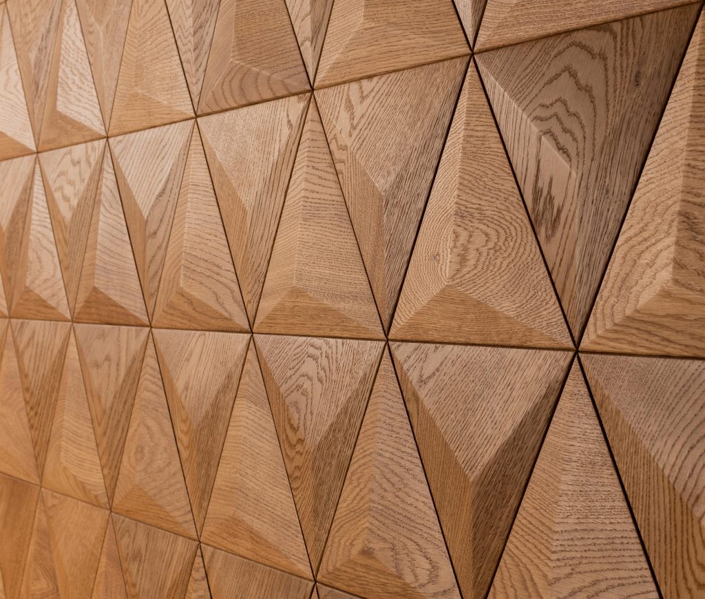Po dokładnej analizie wybrano odpowiedni kolor, który zastosowano do wykończenia paneli 3D na ścianę – w sumie 22,3 m² dębowych paneli ściennych 3D w modelu DIAMOND.