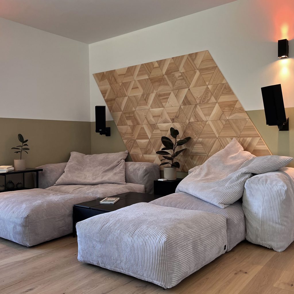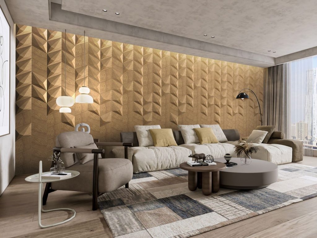 Panele na ścianę drewno w geometrycznym wzorze 3D w przytulnym wnętrzu.