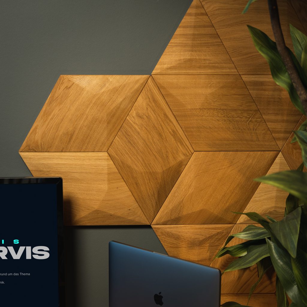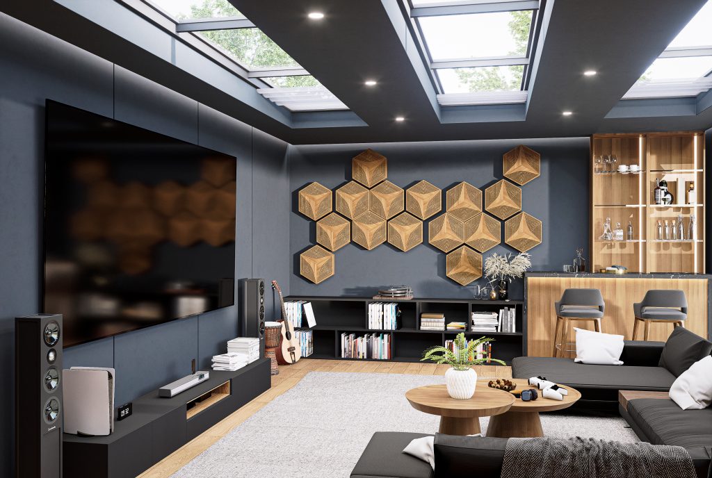 - Zacznij od paneli akustycznych (HEXAGO), potem dodaj dekoracyjne
