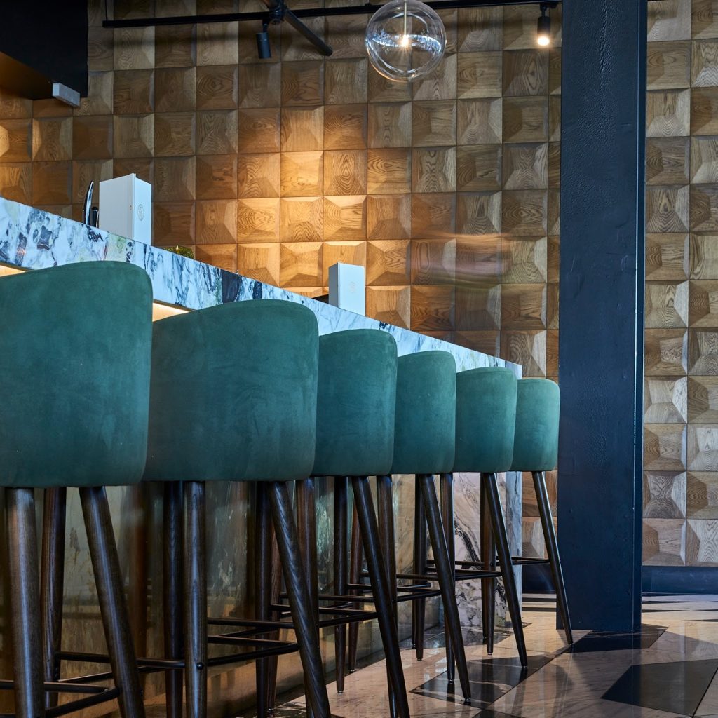 Fronty szuflad, elementy konstrukcyjne, wykończenie barku – drewno jako punkt kulminacyjny, nie dominanta.