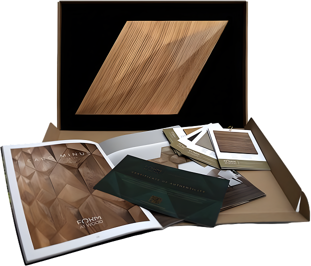 Twoje pudełko z próbkami zostało zaprojektowane tak, aby zapewnić Ci pełnię wrażeń. Znajdziesz w nim konkretny kształt panelu drewnianego, o który prosiłeś, materiały świadczące o najwyższej jakości oraz opcje, które pomogą Ci wybrać idealne wykończenie. Zobacz, co znajduje się w środku: