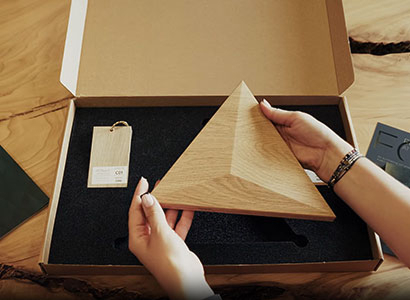 Nasz Sample Box został zaprojektowany, aby umożliwić Ci praktyczne zapoznanie się z naszymi panelami. Zawiera wybrany kształt panelu drewnianego, kartę kolorów do przeglądania opcji wykończenia oraz nasz katalog pełen inspiracji.